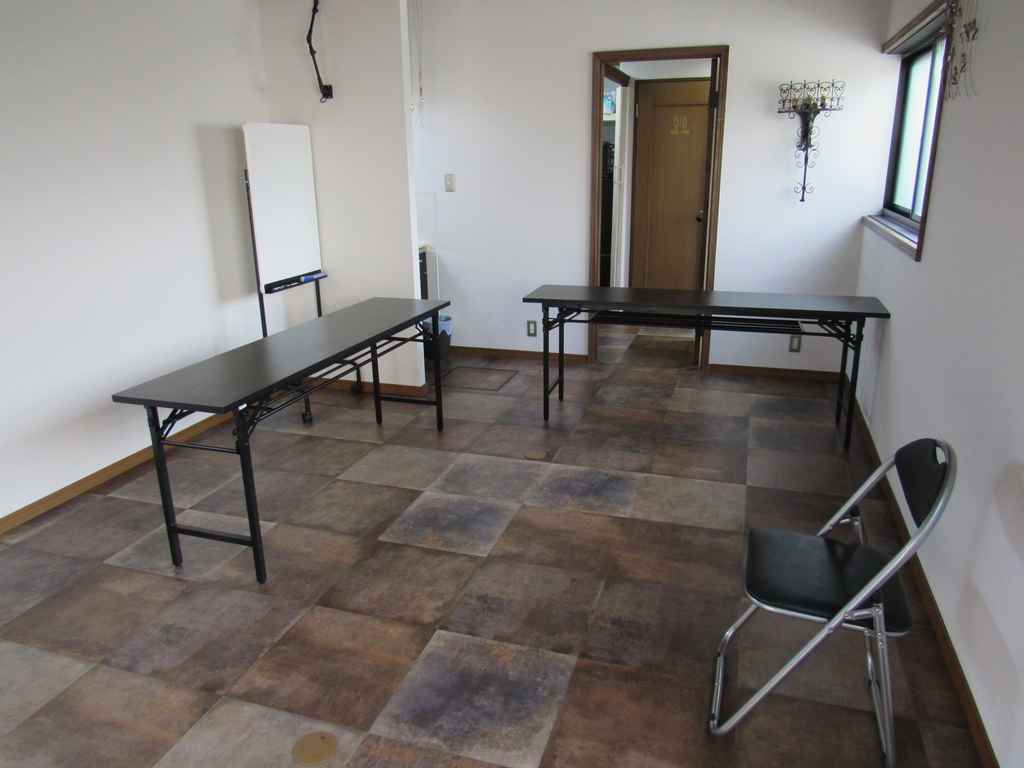 室内は広々とした空間で、机と椅子を並べてシミュレーションをしたところ、自分を入れて最大10人くらいは座れそうです。