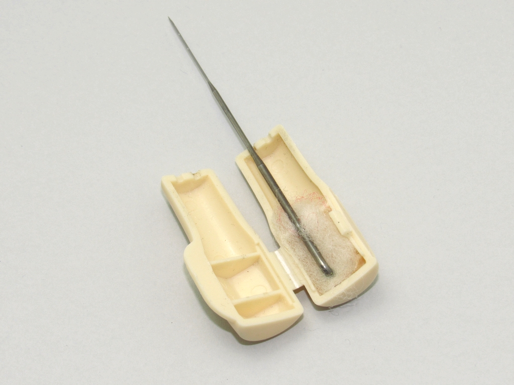 半分にパカっと割れるので、少し分かりづらいのですが、ニードルの曲がっている部分を差してセットします。