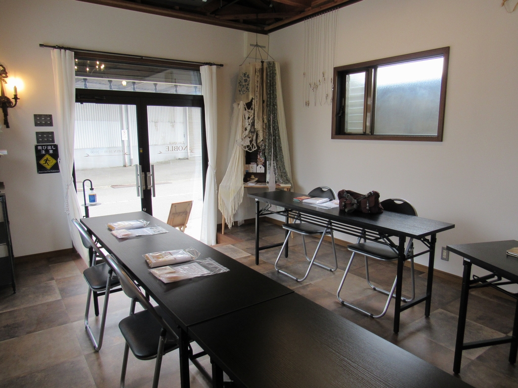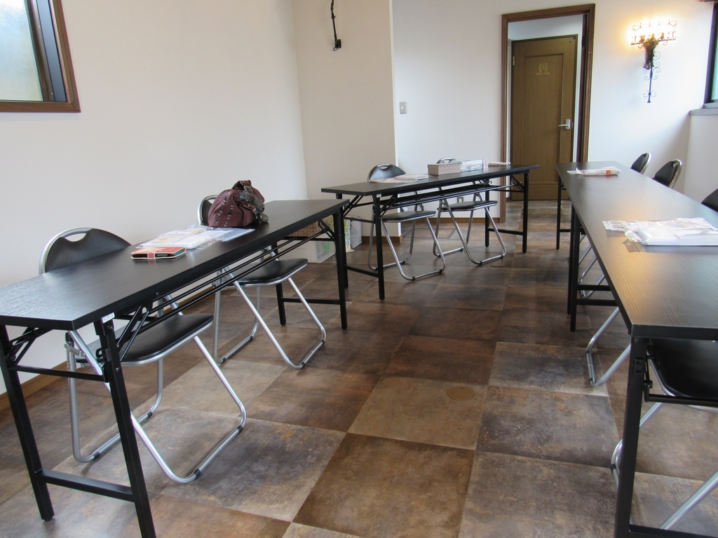 屋内スペースに机と椅子を並べました。
