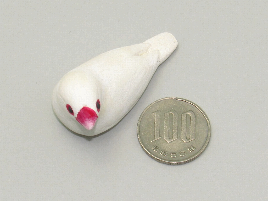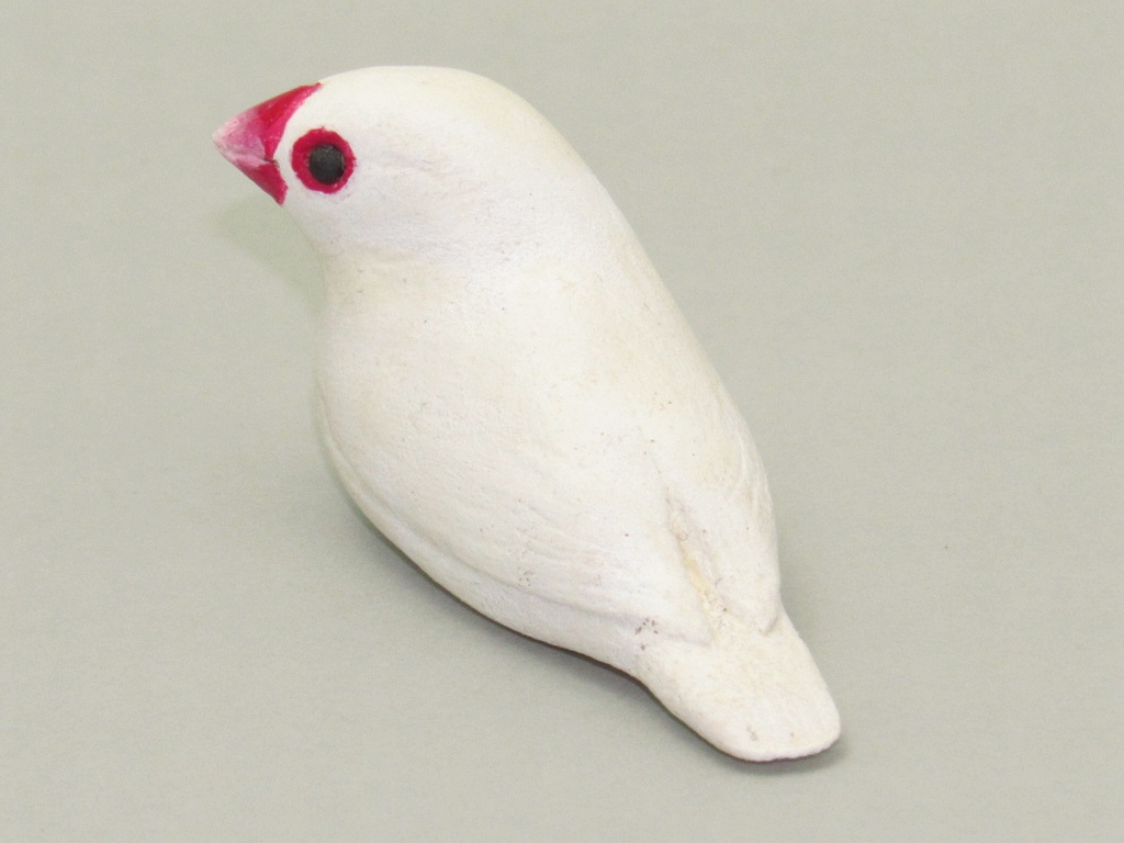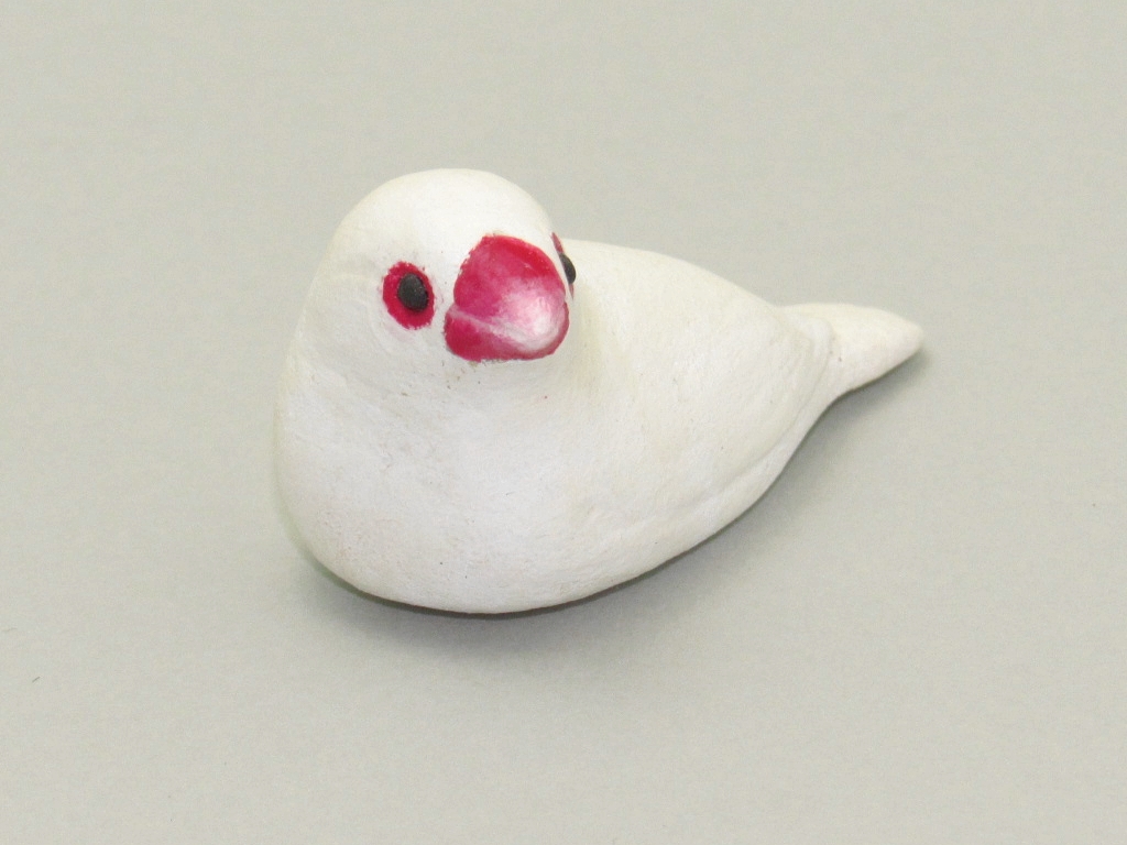 なんとなく文鳥の形になるように原型を作って、サンドペーパーや金属のヤスリなんかで整え、アクリル絵の具で着色しました。
