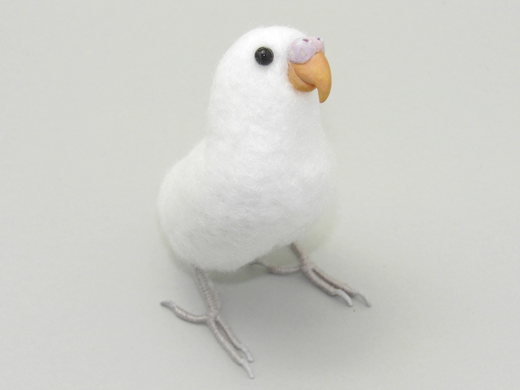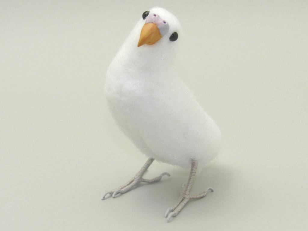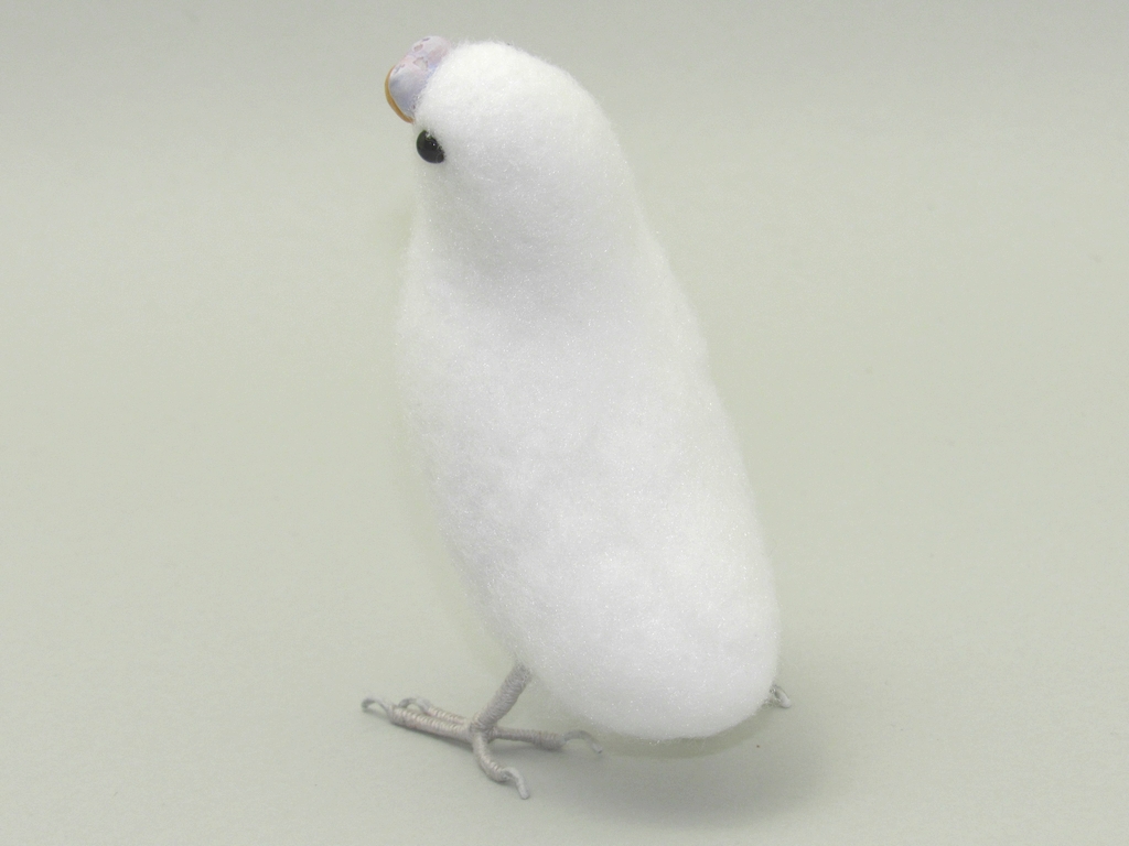 真っ白な状態ではイメージが湧かないので、目(プラスチックアイ)とクチバシを取り付けてみました。