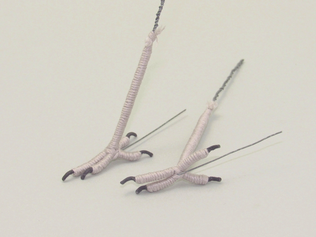 今回は止まり木に止まらせるので、止まり木と接続するために足底からもワイヤーを出してあります。