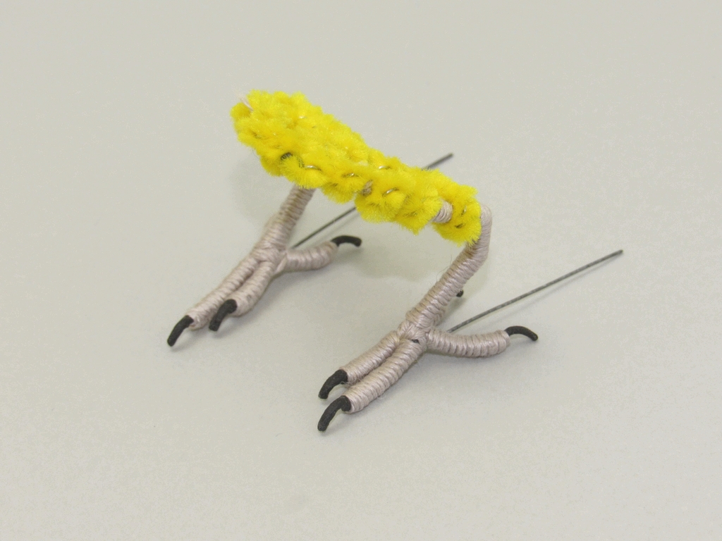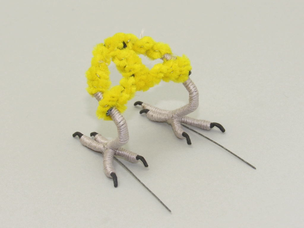 左右作り鳥の足っぽく曲げて2本を接続し、その上からラッピング等で使うモールを巻き付けます。