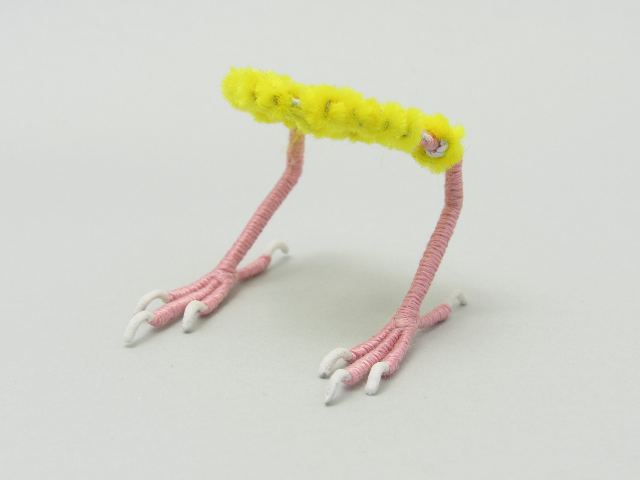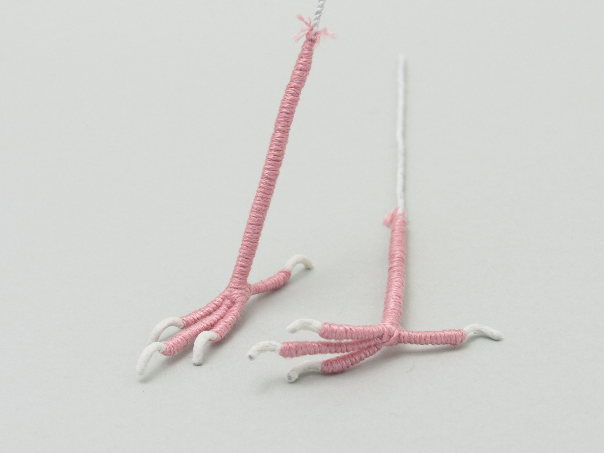 鳥の足っぽく曲げて2本を接続し、その上からラッピング等で使うモールを巻き付けます。