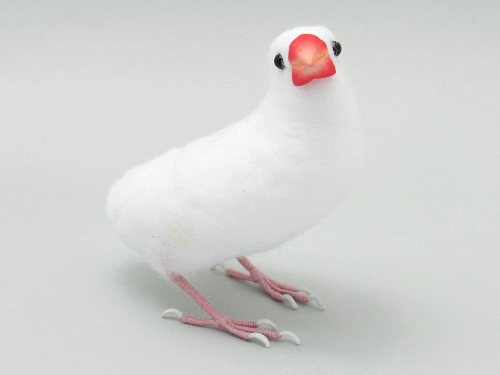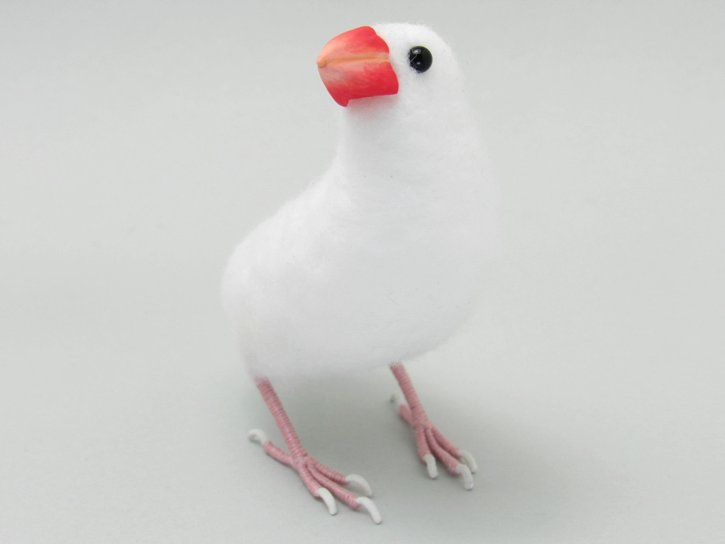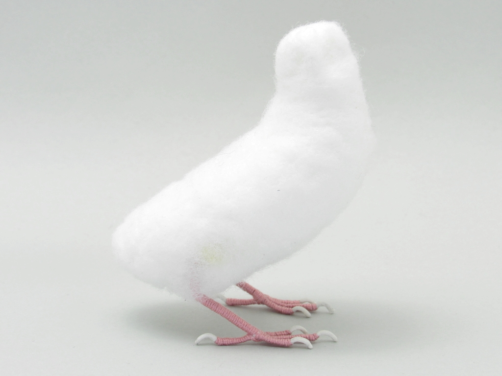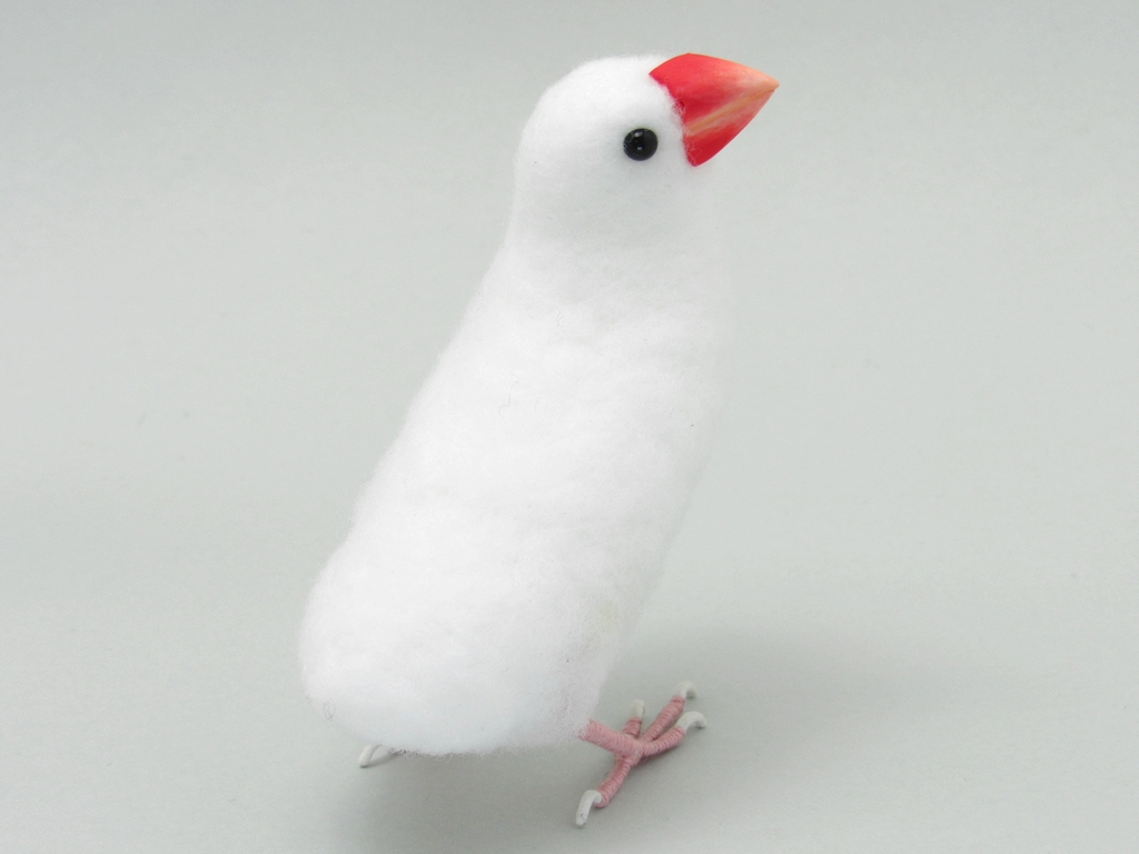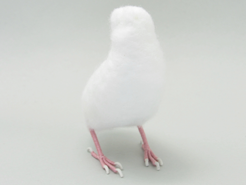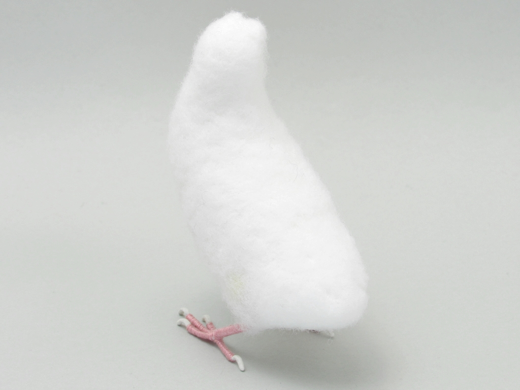 この上から刺していく羊毛で多少融通はききますが、目・クチバシ・足の位置や角度がほぼここで決まってしまうので、あらゆる角度から見て納得いくまで調整するようにしています。