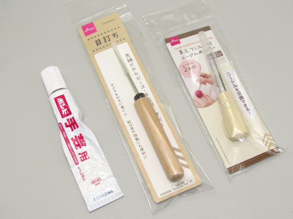 左から「手芸用ボンド」「目打ち」「ニードルホルダー」です。どれも100均ショップで手に入ります。