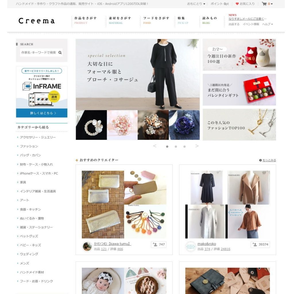まず、上の画像は クリーマ ( https://www.creema.jp/ ) のトップページで、2024年 2月 4日(日) 12時30分 くらいのスクリーンショットです。