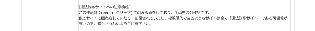 今回紹介したサイトが詐欺サイトであると断言できるのは、この作品はクリーマでしか販売していないことが決定的なのではありますが、初見の方には判断できないと思いましたので、紹介文に以下の文章を入れてありました。