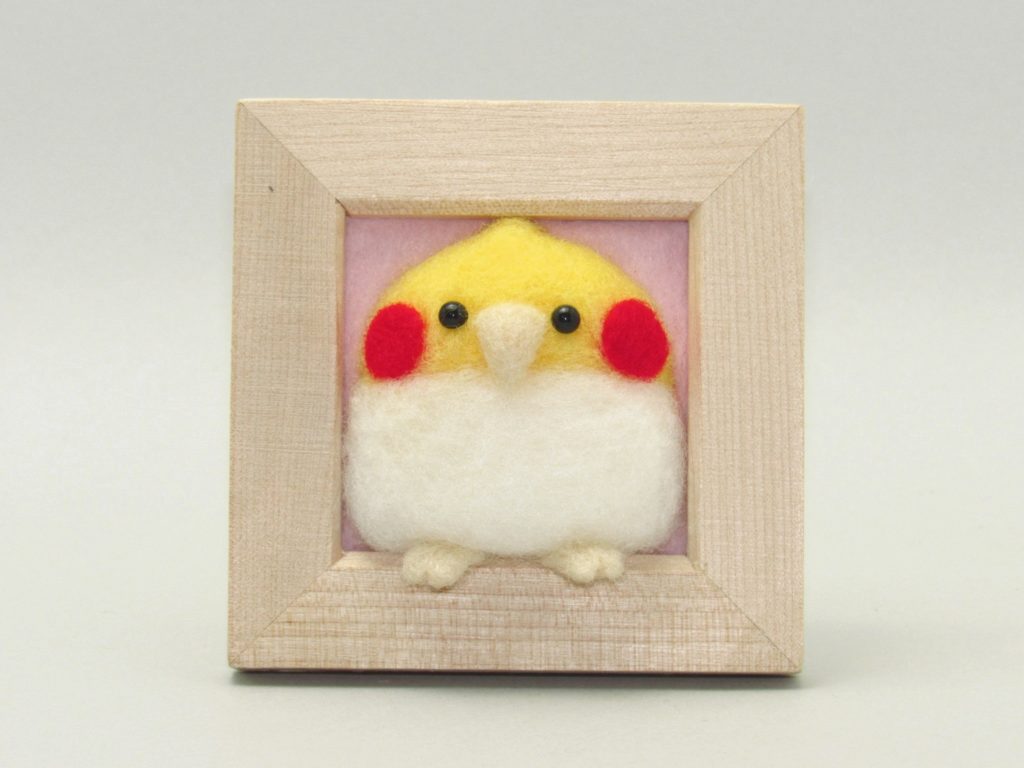 小さな木製のフレームの中に、かわいいオカメインコがちょこんと止まっている感じの作品を作ります。
